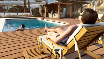 Der Außenbereich kann mit weiteren Annehmlichkeiten ebenfalls überzeugen und bietet euch einen erholsamen Yoga-Bereich und Fitnessgeräte, deren Benutzung eure Statistiken kurzzeitig steigert, sowie einen Pool und einen Whirlpool. Wenn ihr eure Familie um ein oder zwei tierische Begleiter erweitern möchtet, gönnt euch doch den ultimativen Luxus und besucht die Hundehütte draußen oder das Katzenbett im Wohnzimmer.