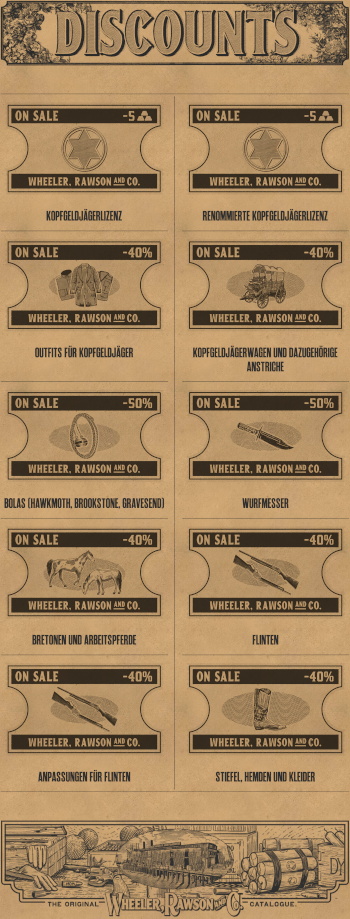 Es geht auf keine Kuhhaut, dass irgendein dahergelaufener Viehtreiber mit einem Schießeisen die Gipfel und Täler des Grenzlandes unter Einsatz tödlicher Gewalt bewacht. Kopfgeldjäger brauchen Papiere, und sowohl die normale Kopfgeldjägerlizenz als auch die renommierte Kopfgeldjägerlizenz sind diesen Monat um 5 Goldbarren reduziert. Besorgt euch eure Papiere und macht euch auf die Jagd.