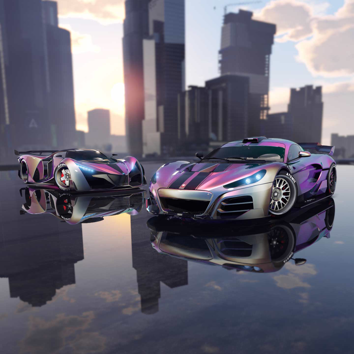 Verleiht euren Lieblingsfahrzeugen etwas Glanz mit der Chamäleon-Lackierung und -Felgenfarbe „weiß-lila Flop“. Besucht eine Fahrzeugwerkstatt, um diese Veredelungen auftragen zu lassen.